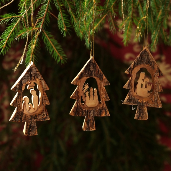 Weihnachtsdeko Baumschmuck Krippe im Tannenbaum mit Rinde 3er Set