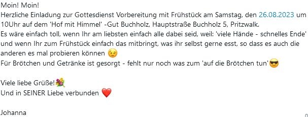 Herzliche Einladung zur Gottesdienst Vorbereitung mit Frühstück am Samstag, den 26.08.2023 um 10Uhr auf dem 'Hof mit Himmel' -Gut Buchholz, Hauptstraße Buchholz 5, Pritzwalk.