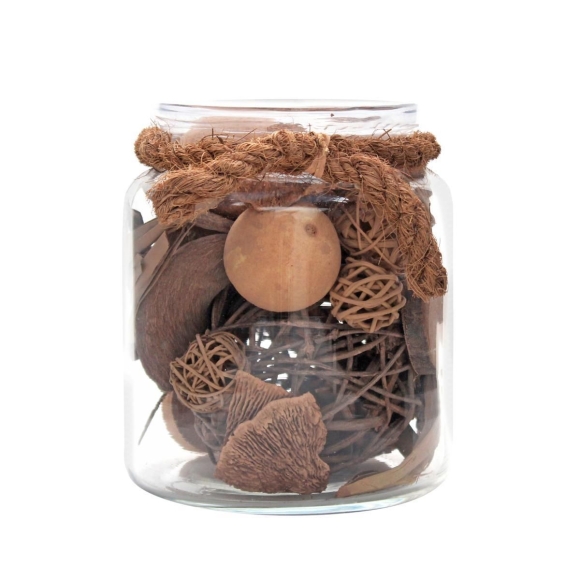 **Dekoglas für Ihr Zuhause**Dieses schöne Dekoglas eignet sich hervorragend zur Platzierung auf Tischchen, Regalen oder Anrichten. Es lässt sich durch die Höhe von ca. 16,5 cm und den Durchmesser von ca. 13,5 cm beliebig platzieren. Der exotische Mix getrockneter Pflanzenteile in Brauntönen, mit dem das transparente Glas gefüllt ist, ist am Rand mit einer doppelten Kordel verziert. Für das eigene Zuhause oder als Geschenk – das schlichte Design und die Naturfarben in Braun passen ideal in jede Einrichtung und zu jedem Wohnraum. Durch die Handfertigung und die Naturmaterialien ist jedes Glas ein einzigartiges, individuell befülltes Unikat, das vom Bild abweichen kann.