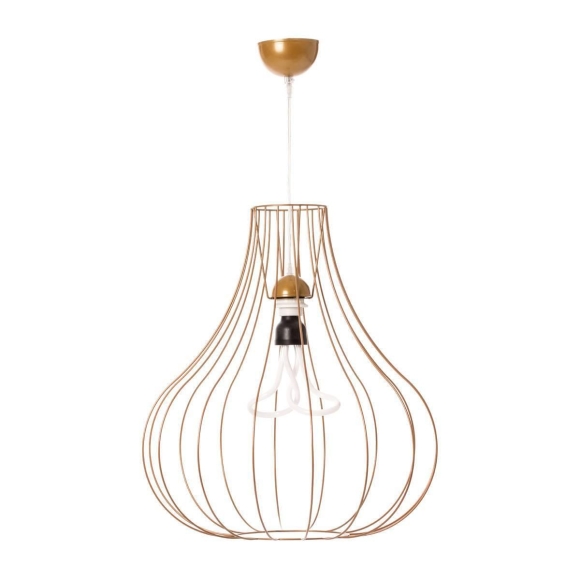 **Stilvolle Deckenlampe in minimalistischem Design**Wenn Sie in Ihrer Umgebung neue Akzente setzen möchten, dann sind Sie mit dieser Deckenlampe gut beraten. Die Lampe gibt sich in industriellem, minimalistisch gehaltenen Design. Das Gestell des Lampenschirms aus beschichtetem Draht wurde stilvoll in Form gebracht. Gleichmäßige Abstände zwischen den einzelnen Drahtsträngen sorgen für ein harmonisches Gesamtbild und integrieren die ansonsten schlichte Lampe optimal in Ihre Wohneinrichtung. Durch den außergewöhnlichen Lampenschirm ergeben sich bei eingeschaltetem Licht tolle Strahleneffekte, die dem Raum eine bezaubernde Atmosphäre verleihen. Doch egal, ob die goldene Lampe ein- oder ausgeschaltet ist – sie ist jederzeit dekorativ und trendig. Die Deckenlampe ist in verschiedenen dezenten Farben, wie Schwarz, Weiß, Gold oder Silber, sowie unter anderen Namen in verschiedenen attraktiven und zum Teil außergewöhnlichen Formen erhältlich. Jede Form hat dabei ihren ganz eigenen Charakter, der sich auch auf den Raum überträgt. In unserem Sortiment ist für jeden Geschmack und jeden Anspruch die passende Form dabei. Ob flach mit einer geringen Höhe von ca. 25 cm oder länglich und schmal mit ca. 60 cm Höhe für höhere Räume – schauen Sie sich unsere verschiedenen Hängelampen der Serie an. Metallteile zur Aufhängung und ein farblich passendes Kunststoffkabel von ca. 80 cm Länge komplettieren das Produkt. Bestellen Sie Ihre Lieblingsvariante als Einzelstück oder auch eine Kombination verschiedener Varianten. Entwickeln Sie mit diesen Lampen eine individuelle Raumbeleuchtungs-Komposition, die Ihr persönliches Einrichtungs-Konzept hervorragend ergänzt. Setzen Sie zum Beispiel Ihre Bilder und Gemälde mit der attraktiven Lampe gekonnt in Szene oder machen Sie es sich im Schein der Lampe auf einem bequemen Sitzkissen gemütlich.Der Lampenschirm ist unten geöffnet, sodass Leuchtmittel ganz einfach getauscht werden können. Benötigt werden E27-Leuchtmittel mit max. 40 Watt, die im Lieferumfang nicht enthalten sind.
