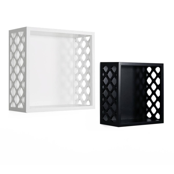 **2er-Set Wandregale**In einem modernen Zuhause ist diese stilvolle Wanddekoration genau richtig. Das Set besteht aus zwei quadratischen Boxen zur Wandaufhängung. Die kontrastreichen Farben Schwarz und Weiß sowie die unterschiedlichen Größen von 27 x 27 und 23,5 x 23,5 cm machen aus den Boxen ein harmonisches Paar. Highlight der Wandregale sind die Seitenwände, in welchen moderne handgeschnitzte Muster zu finden sind. Ein schönes Gesamtbild erhalten Sie durch die Platzierung kleiner Dekoartikel wie zum Beispiel kleinen Vasen mit Blumen. Die Wandregale sind in verschiedenen Variationen und Farben erhältlich.