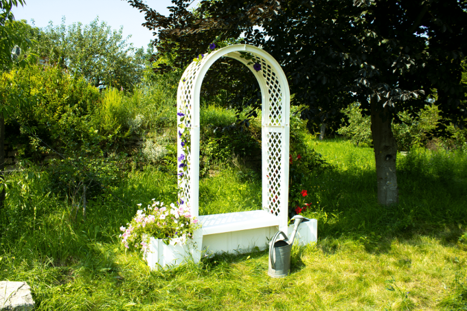 KHW Gartenbank "Brüssel", mit 2 Pflanzkästen.Abmessungen B 174x49xH207 cm.Gemütliche und stabile Gartenbank.Inklusiv einem Rundbogen.Einfache Montage ohne zusätzliches Werkzeug – nur durch Zusammenstecken der einzelnen Teile.
