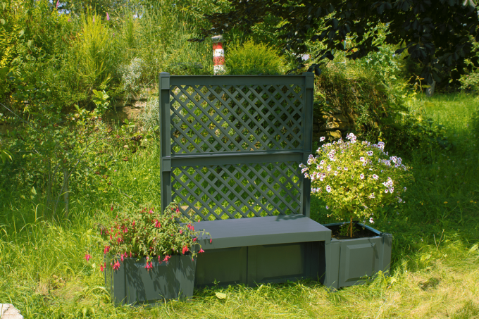 Stabile Gartenbank mit 2 Pflanzkästenund Spalier.Abmessungen aufgebaut: B 174 x T 49 x H139 cm.Diese gemütliche und stabile Gartenbankaus Kunststoff lädt geradezu zum Verweilen ein - tagsüber mal eine kleine Pausewährend der Gartenarbeit oder abends mit einem Gläschen Wein. An jeder Seiteder Bank ist ein Pflanzkübel angebracht, in dem auch noch Ihre Lieblingsblumeneinen schönen und dekorativen Platz bekommen.Hergestellt aus 100 % Kunststoff – pflegeleicht,wetterfest und UV-stabil.