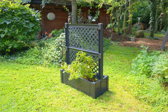 Pflanzkasten mit Zentralspalier 100 cm, für die beidseitige Bepflanzung mit Kübelpflanzen bzw. Rankpflanzen. Abmessungen aufgebaut B 100 x T 43 x H 140 cm. Hergestellt aus 100 % Kunststoff, pflegeleicht und UV-stabil. Einfache Montage ohne zusätzliches Werkzeug – nur durch Zusammenstecken der einzelnen Teile. Kombinierbar mit weiteren Rankgittern und Pflanzgefäßen dieser Serie.