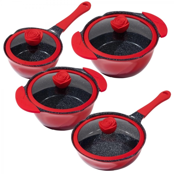 Das 4 teilige KING® Kochtopfset »Rosenblüte« bietet 3 Töpfe und 1 Bratpfanne: 18cm Stieltopf, 20cm Kochtopf, 24cm Kochtopf und 24cm Bratpfanne. Alle Töpfe und die Bratpfanne sind aus Aluguss gefertigt und sind innen mit der langlebigen Antihaft- Keramikbeschichtung FUSION TI® von WHITFORD ausgestattet. Die Glasdeckel verfügen über einen umlaufenden Silikonrand. Die Keramikbeschichtung hat besonders viele und gute Eigenschaften: Sie ist besonders hart, sie ist frei von PTFE, sie ist sehr widerstandsfähig und hat einen geringen Verschleiß. Die Keramikbeschichtung schützt die Töpfe und die Bratpfanne vor Kratzern und Abrieb und fördert somit die Langlebigkeit. Da nur wenig Fett zum Anbraten benötigt wird, ist das Kochen mit den Keramik beschichteten Kochtöpfen und der Bratpfanne besonders bekömmlich. Zudem sind die Töpfe und die Bratpfanne dank Keramikbeschichtung sehr pflegeleicht. Der Stieltopfgriff, der Bratpfannengriff und die Griffe der Glasdeckel sind besonders angenehm anzufassen. Die Kochtopfgriffe sind mit leicht abnehmbaren Silikonpads im besonderen Rosenblatt-Design ausgestattet.  Das 4 teilige KING® Kochtopfset »Rosenblüte«  ist für alle Herdarten geeignet, auch INDUKTION.hochwertige und langlebige Keramikbeschichtunginklusive Silikonpads im Rosenblatt-DesignStieltopfgriff und Pfannengriff mit Soft-Touch Ausstattung- liegen besonders angenehm in der Hand,  Deckelgriffe ebenfalls mit Soft-Touch AusstattungKeramik-Beschichtung Innen: WHITFORD FUSION® TIfür alle Herdarten geeignet: Gas, Elektro, Glaskeramik, Induktionfrei von PTFE, besonders kratzfest, fettarme und fettfreie Zubereitung der Speisen, Optimale Wärmeleitung, pflegeleicht