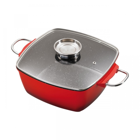 Der hochwertige Aluguss-Bräter ist Innen FUSION® beschichtet, keramische „Antihaft“ von Whitford, sie ist besonders kratzfest gegenüber konventionellen Beschichtungen. Der KING Aluguss-Bräter ist vielseitig einsetzbar: ob auf dem Herd oder im Backofen* ein echter Allrounder. Über den Aromaknopf im Deckel spielend Flüssigkeiten hinzufügen – für den perfekten Braten. Geeignet für alle Herdarten auch INDUKTION.Inhalt: 1x Bräter mit Glasdeckel 28x28cmBesonderheiten:Aromaknopf im Deckel: Spielend Flüssigkeiten hinzufügen – für den perfekten Bratenlanglebige Keramikbeschichtung FUSION® von WHITFORD.Die keramische Antihaft-Beschichtung FUSION® ermöglicht fettreduziertes Braten und eine hervorragende Hitzeverteilung.Herd- und Backofen geeignet: bis 180°C mit Deckel bis 240°C ohne DeckelFassungsvolumen Bräter: ca. 5.0 Literfür alle Herdarten geeignet, auch Induktionbesonders kratzfest, fettarme und fettfreie Zubereitung der Speisen,Optimale Wärmeleitung, pflegeleichtAchtung: Bei der Verwendung im Backofen erhitzen sich alle Bestandteile des Bräters. Verwenden Sie Topflappen- oder Ofenhandschuhe. Für die Langlebigkeit des Kochgeschirrs vermeiden Sie bitte den Gebrauch von spitzen, scharfen und kratzenden Gegenständen beim Kochen und Braten. Reinigen Sie Ihr Kochgeschirr immer per Handwäsche - mehrmalige Spülmaschinenwäsche kann die Beschichtung beschädigen. Beschädigungen in der Beschichtung beeinträchtigen die Antihaft-Funktion und machen das Kochgeschirr unnutzbar.
