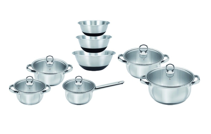 KING Topf-Set New Silver Line + Schüsselset Black Steel 3tlg.Das hochwertige 5/10 teilige Kochtopfset KING New Silver Line aus Edelstahl darf in keiner Küche fehlen. Alle Töpfe haben einen Deckel mit praktischem Dampfablass und sind für alle Herdarten geeignet, auch Induktion. Zum Kochtopfset gibt’s das praktische Schüsselset Black Steel. Inhalt:1 Stieltopf mit Deckel ca. ø 16 cm je 1 Kochtopf mit Deckel ca. ø 16 / 18 / 20 / 24 cm und Schüssel-Set Black Steel in den Größen ca. ø 16, 18 und 22 cm