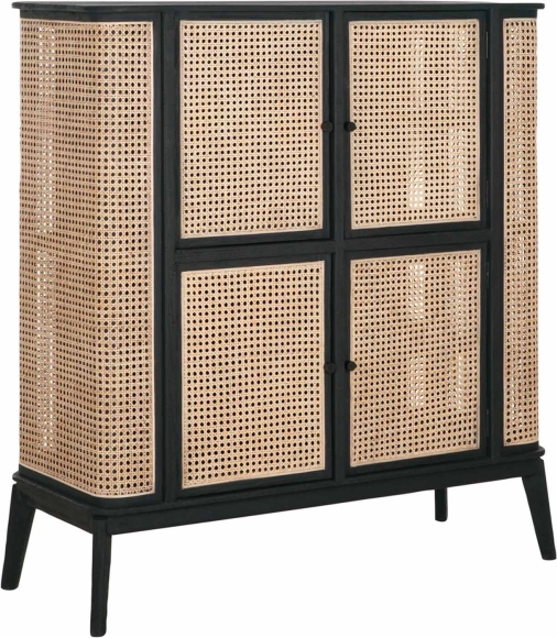 Schrank Raffles - edles Design im angesagten Boho Look. Wer den Boho Stil und nat�rliche Materialien in seinem Zuhause liebt der wird um die Raffles Serie der niederl�ndischen Marke Must Living nicht drumrum kommen. Die komplette Serie wurde per Hand aus Mindiholz gefertigt und in schwarz bemalt. Das Rattangeflecht schmiegt sich elegant um das schwarze Holz und bietet einen schicken Kontrast. Die Ecken bei diesem M�belst�ck sind abgerundet was dem ganzen nochmal eine gewisse Leichtigkeit verleiht.