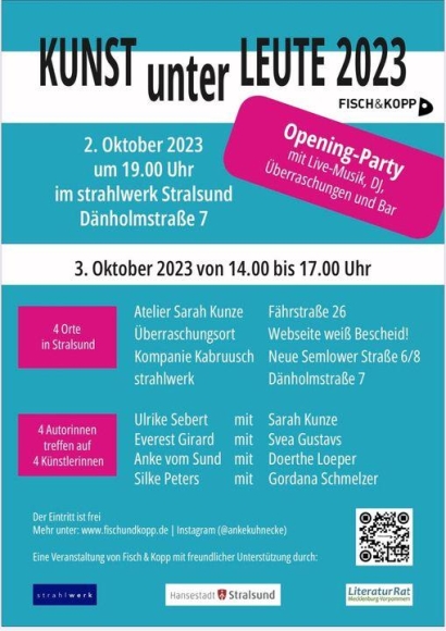 Am 2. und 3. Oktober wird’s bunt in Stralsund. Bei KUNST unter LEUTE 2023 sind am 3. Oktober von 14.00 bis 17.00 Uhr 4 Autorinnen bei 4 Stralsunder Künstlerinnen an 4 besonderen Orten zu Gast. Mehr unter www.fischundkopp.de. Und am 2.Oktober startet das Ganze mit einer Opening-Party im strahlwerk. Um 19.00 geht’s los in der Dänholmstraße 7. Eintritt ist frei. Spenden für die Musiker sind willkommen.
