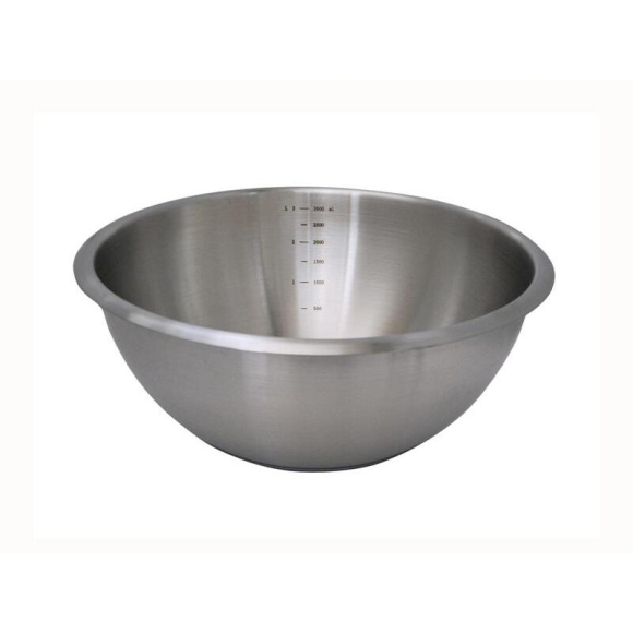 Halbkugelförmige Schüssel DE BUYER ("Cul de poule") Ø 20 cm Edelstahl mit rutschfestem Silikonboden und Innenskalierung. Fassungsvermögen: 2,1 l.