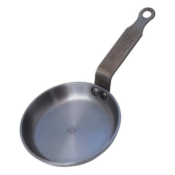 Blinispfanne DE BUYER " MINERAL " Durchmesser 12 cm. Das Kochgeschirr " MINERAL " ist für alle Herdarten geeignet (Gas - Strom - Induktion - Glaskeramik). Sie werden aus Eisen (einem zu 100 % natürlichen Mineralwerkstoff) hergestellt und sind garantiert frei von Beschichtungen (weder PFOA noch PTFE) und chemischen Zusätzen. Es handelt sich um umweltfreundliche und nachhaltige Produkte. Die Lebensmittel werden an der Oberfläche angebraten, sodass ihre natürlichen Säfte karamellisieren können, was für den guten Geschmack sorgt. Es bildet sich eine Kruste, die verhindert, dass die Feuchtigkeit verdunstet. Die Speisen werden an der Oberfläche goldbraun und knusprig, während sie im Inneren schmelzen und weich werden. Dies ist die ideale Lösung, um Fleisch anzubraten, knusprige Pfannkuchen oder Omeletts zuzubereiten. Spezifische Hinweise, die vor dem ersten Gebrauch und der Pflege genau zu beachten sind, werden mit jedem Kochgeschirr mitgeliefert. Nicht spülmaschinengeeignet.