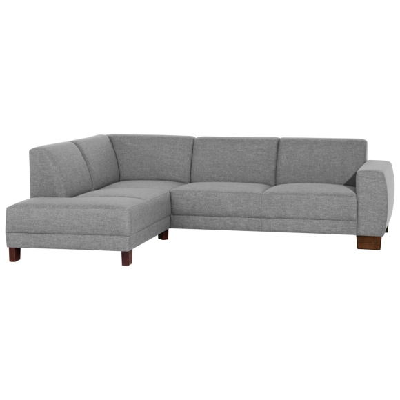 Modernes, geradliniges Ecksofa mit offenem Abschluss. Ein Klassiker in zeitlos moderner Formensprache. Der niedrige, leicht gewölbte Rücken macht dieses Sofa zur perfekten Loungegarnitur.  Der Bezug aus Flachgewebe in moderner Leinenstruktur mit angenehmen Griff und die massiven Buchefüße in dunklem Nussbaumfarbton komplettieren das Gesamtbild. Der Rücken ist ebenfalls im Originalstoff bezogen, damit ist die Polsterecke frei im Raum stellbar. ·248x188x75 in cm (BxTxH) ·Nettogewicht 37 kg ·Flachgewebe (Leinenoptik) ·100 % Polyester ·Sitzhärte mittel ·Anzahl Sitze 6 cm ·Wellenunterfederung, Polyätherschaum mit Diolenabdeckung ·Fußfarbe Buche nussbaum dunkel ·stabiles Holzgrundgestell aus Massivholz und Holzwerkstoffen ·Bodenfreiheit 10 cm ·Armteilhöhe innen vorn/hinten 17 cm ·Höhe ohne Füße 68 cm ·Rückenhöhe innen 41 cm ·Sitzbreite vorn/hinten cm ·Sitztiefe 60 cm ·Sitzhöhe 42 cm