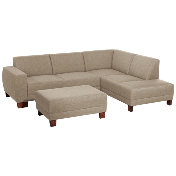 Modernes, geradliniges Ecksofa mit offenem Abschluss. Ein Klassiker in zeitlos moderner Formensprache. Der niedrige, leicht gewölbte Rücken macht dieses Sofa zur perfekten Loungegarnitur.  Der Bezug aus Flachgewebe in moderner Leinenstruktur mit angenehmen Griff und die massiven Buchefüße in dunklem Nussbaumfarbton komplettieren das Gesamtbild. Der Rücken ist ebenfalls im Originalstoff bezogen, damit ist die Polsterecke frei im Raum stellbar. ·248x188x75 in cm (BxTxH) ·Nettogewicht 37 kg ·Flachgewebe (Leinenoptik) ·100 % Polyester ·Sitzhärte mittel ·Anzahl Sitze 6 cm ·Wellenunterfederung, Polyätherschaum mit Diolenabdeckung ·Fußfarbe Buche nussbaum dunkel ·stabiles Holzgrundgestell aus Massivholz und Holzwerkstoffen ·Bodenfreiheit 10 cm ·Armteilhöhe innen vorn/hinten 17 cm ·Höhe ohne Füße 68 cm ·Rückenhöhe innen 41 cm ·Sitzbreite vorn/hinten cm ·Sitztiefe 60 cm ·Sitzhöhe 42 cm