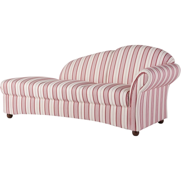 Vollpolsterrecamiere mit Chatosenseitenteil im Landhausstil. Romantisch verspielt gibt diese wunderschöne Recamiere dem Raum eine besondere Note. Das gestreifte Flachgewebe verleiht ein maritmes Flair. Die dunklen Buchefüße runden das Gesamtbild ab. Der Rücken ist mit Originalstoff bezogen, somit ist die Recamiere frei im Raum stellbar. Die Füße sind zur einfachen Selbstmontage. ·191x81x83 in cm (BxTxH) ·Nettogewicht 51 kg ·Flachgewebe ·50% Baumwolle, 50% Polyester ·Sitzhärte mittel ·Anzahl Sitze 3 ·Wellenunterfederung, schaumummantelter Federkern, Polyätherschaum, Diolenabdeckung ·Fußfarbe Buche nussbaum dunkel ·stabiles Holzgrundgestell aus Massivholz und Holzwerkstoffen ·Bodenfreiheit 6 cm ·Armteilhöhe innen vorn/hinten 20 cm ·Höhe ohne Füße 68 cm ·Rückenhöhe innen 37 cm ·Sitzbreite vorn/hinten168 cm ·Sitztiefe 53 cm ·Sitzhöhe 44 cm