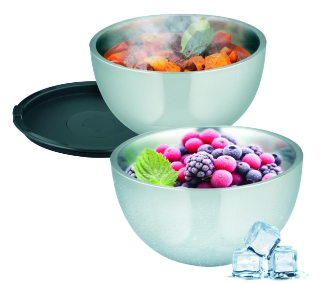 Meine Küche Schüsselset 2 tlg. (17 und 21 cm), Heiss&KaltDoppelwandige Thermoschüsseln aus Edelstahl mit praktischen Kunststoffdeckel. Innen und außen hochglanzpoliert. Perfekt für die Aufbewahrung, Zubereitung, Servieren oder Transportieren  Ihrer heißen oder kalten Speisen - heißes bleibt heiß und kaltes bleibt kalt.  Die Schüsseln sind spülmaschinengeeignet,Schüsselset bestehend aus: 1 x Schüssel 17 cm, 9,5 cm h, 1,2 Liter1 x Schüssel 21 cm, 11,5 cm H, 2,1 Liter