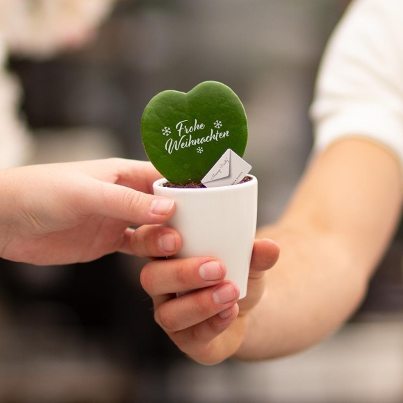 Produktbeschreibung: Die Message Printz® Hoya Kerrii vereint die Schönheit einer pflegeleichten Zimmerpflanze mit einer persönlichen Weihnachtsbotschaft. Das charakteristische herzförmige Blatt trägt die sorgfältig aufgebrachte Gravur "Frohe Weihnachten", die durch fortschrittliche Technologie dauerhaft haltbar ist, ohne die Gesundheit der Pflanze zu beeinträchtigen.. Produkthighlights:. Einzigartiges herzförmiges Blatt mit Weihnachtsgravur in drei wählbaren Sprachen. Message Printz® Qualität, erkennbar am charakteristischen kleinen Umschlag. Pflegeleichte Zimmerpflanze. Hochwertiger weißer Keramiktopf. Nachhaltige Alternative zu klassischen Weihnachtskarten. Im Lieferumfang enthalten:. 1x Message Printz® Hoya Kerrii mit Weihnachtsgravur. 1x Weißer Keramiktopf. Woher kommt die Hoya Kerrii? Die Hoya Kerrii stammt ursprünglich aus Südostasien und gehört zur Familie der Seidenpflanzengewächse (Asclepiadaceae). In ihrer natürlichen Umgebung wächst sie als sukkulente Kletterpflanze.. Wie pflegt man eine Hoya Kerrii? Die Pflanze gedeiht am besten in einem gut beleuchteten Raum, sollte jedoch vor direkter Sonneneinstrahlung geschützt werden. Die ideale Raumtemperatur liegt zwischen 18-25°C.. Wie viel Wasser braucht eine Hoya Kerrii? Gießen Sie die Pflanze alle 2-4 Wochen und achten Sie darauf, dass die Erde zwischen den Wassergaben leicht austrocknet, um Wurzelfäule zu vermeiden.. Welche Erde braucht die Hoya Kerrii? Die Pflanze benötigt durchlässige Erde, die Staunässe verhindert. Eine Mischung aus Kakteen- und normaler Zimmerpflanzenerde ist ideal.. Wie düngt man eine Hoya Kerrii? Während der Wachstumsphase von Frühling bis Herbst genügt eine monatliche Düngung mit einem handelsüblichen Zimmerpflanzendünger.. Welche Schädlinge befallen die Hoya Kerrii? Die Hoya Kerrii ist generell eine robuste Pflanze. Bei ungünstigen Bedingungen können jedoch Schildläuse auftreten. Eine regelmäßige Kontrolle der Blätter ist empfehlenswert.. Ist die Hoya Kerrii giftig? Die Hoya Kerrii gilt als ungiftig und ist daher auch für Haushalte mit Haustieren geeignet.. Besonderheiten der Message Printz® Technologie: Die Message Printz® Gravur wird sorgfältig auf das herzförmige Blatt aufgebracht und beeinträchtigt die Lebensdauer der Pflanze nicht. Bei gesunder Pflege bleibt der Text klar und sichtbar.. Hinweis: Als Naturprodukt kann das tatsächliche Erscheinungsbild der Pflanze in Größe und Form von den Abbildungen abweichen. Die Qualität der Gravur bleibt davon unberührt.