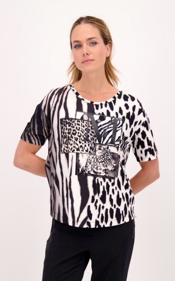 Dieses elegante Monari Shirt Animal Print in der Farbe schwarz weiß überzeugt mit seinem tollen Design. Im Hintergrund wurden Tiger- und Leopardenmuster mit einander kombiniert. Auf der Vorderseite des Damen T-Shirts ist eine Collage mit einem Bild eines Leoparden, sowie Tiermustern, einem Buchstabenemblem und funkelnden Strasssteinen zu sehen. So wurde ein einzigartiger Look kreiert. Der Rundhalsausschnitt des Halbarm Shirts ist mit einer Blende und einer sichtbaren Lurex Overlock-Naht versehen. Dadurch wird dem Damen T-Shirt das gewisse Extra verliehen. Die Regular-Fit Passform mit überschnittenen Schultern und einem abgerundeten Saum sorgen für einen angenehmen Tragekomfort mit Wohlfühlfaktor. Das allover Animal Print Shirt von Monari ist in schwarz weiß gehalten und bekommt somit einen klassischen Look, welcher toll kombiniert werden kann. Ganz lässig für ein entspanntes Freizeitoutfit kannst du das T-Shirt mit einer Jeans kombinieren. Für eine schickere Einladung kann das Animal Print Shirt von Monari toll zu einer engen Stoffhose und einem Blazer getragen werden.