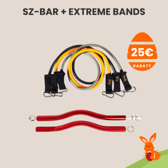 Unsere Neue! Wenn sie "klickt", weisst Du, dass Dein Training startet. Zusammen mit unseren neuen Bands als Bundle - eine umschlagbare Kombi!. Just click it. Unser völlig neues, selbst entwickeltes Verschlusssystem macht einfach Spaß. Wenn Du beide Teile zusammenschiebst, gibt es einen lauten "Klick". Spätestens jetzt weißt Du, dass es losgeht. Jetzt ist Deine Zeit. Du kümmerst Dich um Deine Gesundheit - das ist die wichtigste Zeit des Tages. Deine SZ-bar ist schnell einsatzbereit, sicher arretiert und schon kannst Du starten. "Just click it" eben!. Nail-Protect. So schnell Du sie zusammengebaut hast, genau so schnell ist sie auch wieder zerlegt. Wir haben den Druckknopf und die Ausfräsung vielfach getestet und mit unseren Diplom-Ingenieuren so optimiert, dass Du die SZ Bar problemlos auch mit langen Fingernägeln öffnen kannst. Da bricht keiner ab!. Die Bar mit Schwung. Das Design der SZ Bar haben wir so konzipiert, dass sie perfekt zu greifen ist. Sie ist für jede Körpergröße optimal und Du kannst durch eine einfache Drehung (der SZ Bar um ihre Längsachse) zwischen einem engeren und einem breiteren Griff mit Biegung wählen. Das fühlt sich einfach gut und richtig an - richtig gut eben:). Leichtgewicht. Nur 600 Gramm leicht! Auch die neue SZ Bar bleibt das Herzstück unserer Tools und unseres Trainings. Leicht, stabil und schnell zusammengeklickt! Sie ist ohne Ringe ~78 cm und mit Ringen ~86 cm lang und damit um ca. 5 cm länger als unsere gerade Bar.. Die "großen" Übungen. Mit der neuen SZ Bar kannst Du natürlich weiterhin alle "großen", komplexen Übungen wie Kniebeugen, Deadlift, Schulterpresse, Thrusters usw. hervorragend machen. Der Druckknopf ist dafür extra nach unten ausgerichtet. Damit kann man die Resistance Bands sicher über die Bar legen, ohne dass der Druckknopf überhaupt berührt wird. Dadurch entstehen zwei Schlaufen für die Füße, um mit noch mehr Widerstand trainieren zu können.. Go Extreme. Kombiniert mit den PAKAMA Resistance Bands, unseren neuen PAKAMA Heavy Bands oder unseren PAKAMA Extreme Bands kannst Du Kniebeugen und richtig schwere Deadlifts machen. Mit allen 3 Resistance Bands zusammen an der SZ Bar entspricht das bei Deadlifts (gerne auch “Kreuzheben” genannt) ungefähr:. PAKAMA Resistance Bands: 80 kg. PAKAMA Heavy Bands: 100 - 120 kg. PAKAMA Extreme Bands: 120 - 140 kg. Worauf wartest Du noch? Das ist Deine Möglichkeit, wann und wo auch immer Du willst zu trainieren, genau so, als wenn Du in einem Fitnessstudio wärst.
