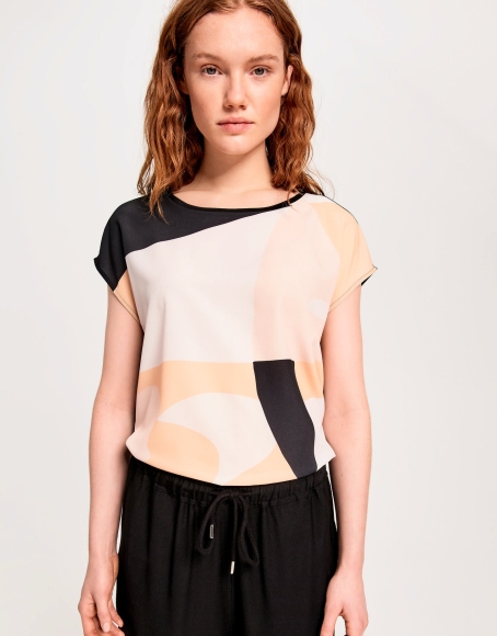 Opus Damen Shirt SafedaDas Opus Damen Shirt Safeda besticht durch seinen vorn kunstvoll gemusterten Print. Die Rückseite ist schwarz. Es besitzt einen U-Boot-Halsausschnitt und angeschnittene Ärmel. Das Opus Damen Shirt Safeda ist in 2 modernen Farben zu erhalten. Kombinierbar ist das Damen Shirt mit z. B. einer schwarzen Haremshose oder einem schwarzen Faltenrock. Details:+ leger fallendes Shirt+ erhältlich in schwarz oder blau+ U-Boot-Halsausschnitt+ angeschnittene ÄrmelMaterial:Materialmix: 100 % Viskose, 100 % Polyester