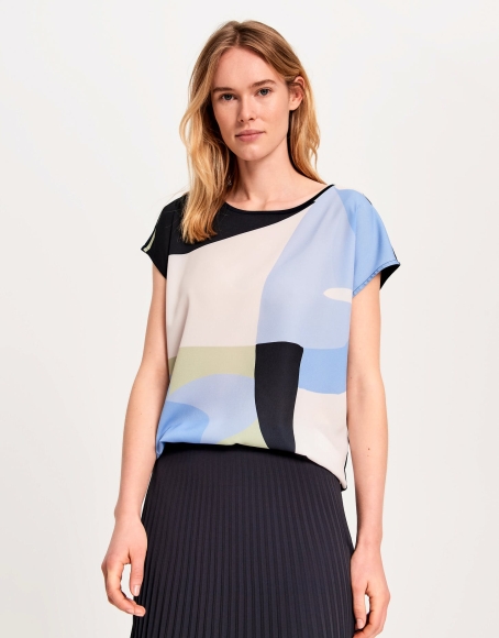 Opus Damen Shirt SafedaDas Opus Damen Shirt Safeda besticht durch seinen vorn kunstvoll gemusterten Print. Die Rückseite ist schwarz. Es besitzt einen U-Boot-Halsausschnitt und angeschnittene Ärmel. Das Opus Damen Shirt Safeda ist in 2 modernen Farben zu erhalten. Kombinierbar ist das Damen Shirt mit z. B. einer schwarzen Haremshose oder einem schwarzen Faltenrock. Details:+ leger fallendes Shirt+ erhältlich in schwarz oder blau+ U-Boot-Halsausschnitt+ angeschnittene ÄrmelMaterial:Materialmix: 100 % Viskose, 100 % Polyester