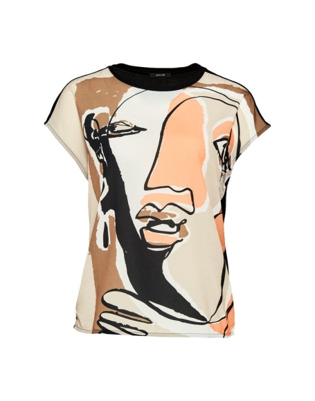 Kunstvolles Damen Shirt Sanosi von OpusDetails+ Farbe: sand, kunstvoller Print+ Vorderseite aus Blusenware, Rückseite aus Viskosemix + bequemer Schnitt und kurze Ärmel + gerade Passform Material Wirkware: 100% Viskose Webware: 100% Polyester