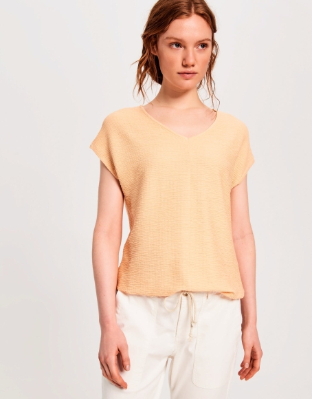 Opus Damen Shirt Suvike Das Opus Damen Shirt Suvike beeindruckt durch seine gerade Form und den V-Ausschnitt. Die angeschnittenen Ärmel verleihen dem Damen Shirt ein sportliches Äußeres. Die gelbe Farbe des Opus Damen Shirt Suvike ist kombinierbar mit z. B. einer weißen Stoffhose oder einer hellen Jeans. Der geraffte Saum  macht ein bequemes Tragen. Mit dem Opus Damen Shirt Suvike sind Sie attraktiv ausgestattet für warme Sommertage.Details:+ gerade Form+ angeschnittene Ärmel+ gelbe Farbe+ V-AusschnittMaterial:90 % Viskose, 8 % Polyester, 2 % Elasthan