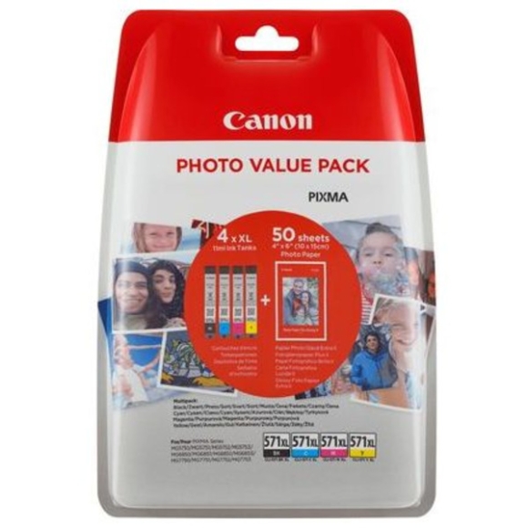 Canon 0332C005 - CLI-571XL Tintenpatrone MultiPack Bk,C,M,Y + Fotopapier 50 Blatt 11ml VE=4 für Canon Pixma MG 5750/7750
