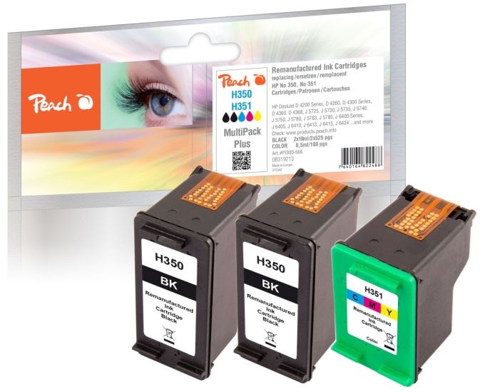 Peach Spar Packs - Sparen Sie zusätzlich gegenüber dem Einzelkauf!2 x Peach Druckkopf schwarz kompatibel zu HP No. 350, CB335EE1 x Peach Druckkopf color kompatibel zu HP No. 351, CB337EEPeach ist eine führende Schweizer Marke für kompatible Tintenpatronen. Spitzentechnologie gewährleistet höchste Qualität und führt zu herrvoragenden Ergebnissen. Farb- und Lichtechtheit entsprechen höchsten Anforderungen und gewährleisten brillante Druckresultate. Um die Premium Qualität sicherzustellen, wird die Tinte im eigenen Entwicklungszentrum in der Schweiz entwickelt und anschliessend in unseren Fertigungsstandorten in die Tintenpatronen abgefüllt. Produktion und Fertigung entsprechen neusten Erkenntnissen aus Lehre und Forschung. Qualität, mit der asiatische Hersteller nicht gleichziehen können und dies zu immer noch sehr attraktiven Preisen. Eine echte Alternative zu teuren Original Produkten oder Billigsttinten.