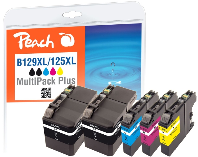 5 Tintenpatronen (2xbk).1 x Peach Tintenpatrone gelb XL, kompatibel zu Brother LC-125XLY1 x Peach Tintenpatrone magenta XL, kompatibel zu Brother LC-125XLM1 x Peach Tintenpatrone cyan XL, kompatibel zu Brother LC-125XLC2 x Peach Tintenpatrone schwarz XXL, kompatibel zu Brother LC-129XLBKPeach ist eine führende Schweizer Marke für kompatible Tintenpatronen. Spitzentechnologie gewährleistet höchste Qualität und führt zu herrvoragenden Ergebnissen. Farb- und Lichtechtheit entsprechen höchsten Anforderungen und gewährleisten brillante Druckresultate. Um die Premium Qualität sicherzustellen, wird die Tinte im eigenen Entwicklungszentrum in der Schweiz entwickelt und anschliessend in unseren Fertigungsstandorten in die Tintenpatronen abgefüllt. Produktion und Fertigung entsprechen neusten Erkenntnissen aus Lehre und Forschung. Qualität, mit der asiatische Hersteller nicht gleichziehen können und dies zu immer noch sehr attraktiven Preisen. Eine echte Alternative zu teuren Original Produkten oder Billigsttinten.