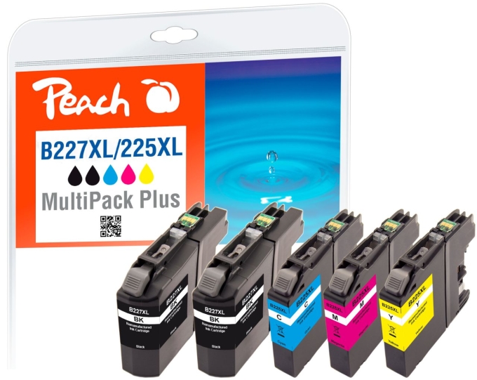 2 x Peach Tintenpatrone schwarz kompatibel zu Brother LC-227XLBK1 x Peach Tintenpatrone cyan kompatibel zu Brother LC-225XLC1 x Peach Tintenpatrone magenta kompatibel zu Brother LC-225XLM1 x Peach Tintenpatrone gelb kompatibel zu Brother LC-225XLY5 Tintenpatronen MIT Chip - Einfach einsetzen und sparen!Peach ist eine führende Schweizer Marke für kompatible Tintenpatronen. Spitzentechnologie gewährleistet höchste Qualität und führt zu herrvoragenden Ergebnissen. Farb- und Lichtechtheit entsprechen höchsten Anforderungen und gewährleisten brillante Druckresultate. Um die Premium Qualität sicherzustellen, wird die Tinte im eigenen Entwicklungszentrum in der Schweiz entwickelt und anschliessend in unseren Fertigungsstandorten in die Tintenpatronen abgefüllt. Produktion und Fertigung entsprechen neusten Erkenntnissen aus Lehre und Forschung. Qualität, mit der asiatische Hersteller nicht gleichziehen können und dies zu immer noch sehr attraktiven Preisen. Eine echte Alternative zu teuren Original Produkten oder Billigsttinten.