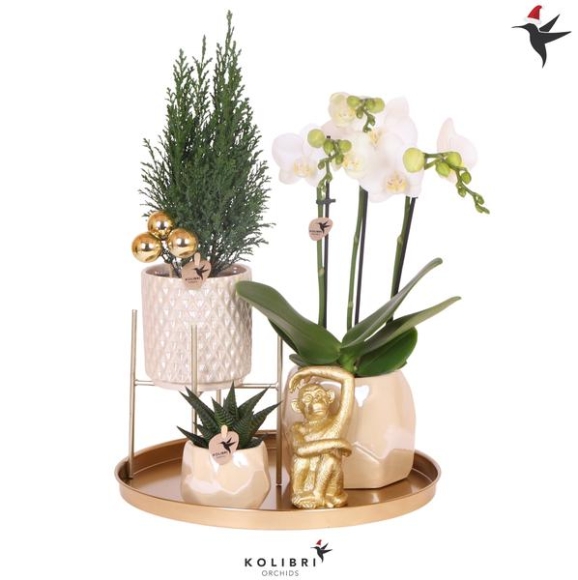 Produktbeschreibung:. Festliches Zimmerpflanzen-Set mit weißer Phalaenopsis Orchidee, Mini-Weihnachtsbaum und Sukkulente in Keramiktöpfen auf goldenem Tablett.. Produkthighlights:. Weiße Phalaenopsis Orchidee (Phalaenopsis Amabilis). Immergrüner Mini-Weihnachtsbaum. Pflegeleichte Sukkulente. Keramiktöpfe und goldenes Tablett. Goldene Affen-Dekofigur. Ideal für: Weihnachtsdekoration, Geschenke, moderne Wohnräume. Lieferumfang:. Phalaenopsis Orchidee. Mini-Weihnachtsbaum. Sukkulente. 3 Keramiktöpfe. Goldenes Tablett. Affen-Dekofigur. Pflege:. Orchidee: Hell, wöchentlich gießen. Weihnachtsbaum: Kühl, feucht halten. Sukkulente: Sparsam gießen, sonniger Standort. Schädlinge: Regelmäßig auf Blattläuse und Spinnmilben prüfen. Giftigkeit: Orchideen sind ungiftig für Haustiere. Hinweis: Leichte Abweichungen vom Foto möglich