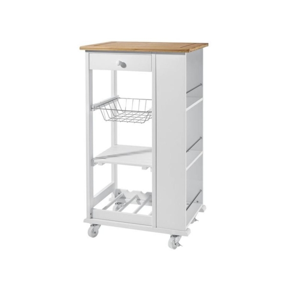 Servierwagen "Nizza" mit 1 Schublade, 1 Metallkorb, 1 Flaschenablage und 4 Ablagen, Bambus-Arbeitsplatte, Weiss lackiert, mit 4 Rollen, von phoenix, designed in der Schweiz, moderner LandhausstilHIGHLIGHTSB/H/T: 50x86x37cmRollwagen mit Arbeitsplatte aus BambusStauraum durch Schublade, Metallkorb, Flaschenhalter und AblageWeiss lackiertmoderner LandhausstilMATERIALMDF lackiertMetallBambus