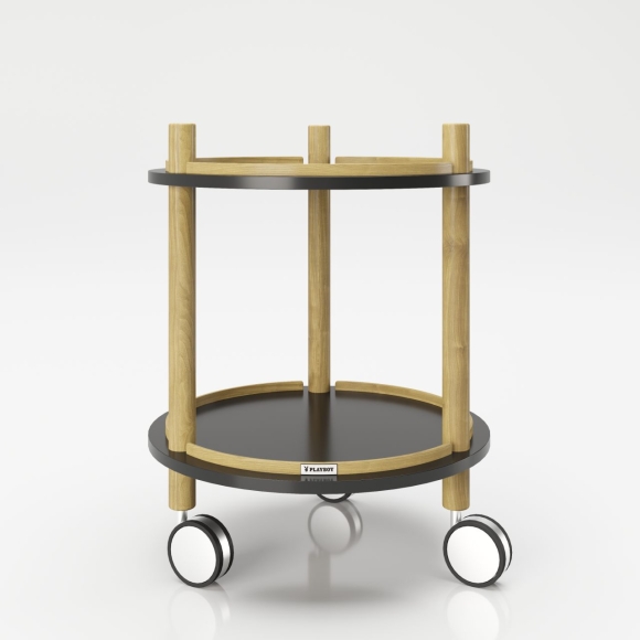 Playboy Rolltisch CARLYDer Rolltisch "Carly"  aus der PLAYBOY-HOME Kollektion ist im Club-Stil der 60er Jahre gehalten. Die 2 schwarzen Ablagen und Holzakzenten runden das Retro-Design vollkommen ab. Der praktische Tisch lässt sich durch die 4 Rollen einfach verschieben und eignet sich für alle Räumlichkeiten. Die beiden Böden bieten genügen offene Ablagefläche für Ihre Dinge. Der mobile Beistelltisch ist auch als Servierwagen gut geeignet.  HIGHLIGHTSBeistelltisch mit 2 AblagenB/H/T: 40x50x40cmeinfaches verschieben durch 3 Rollenschwarze runde AblagenGestell aus MassivholzVintage-Stil der 60er JahrePLAYBOY Retro-Design MATERIAL100% FSC zertifiziertes MDF, Massivholz, NC LackKunststoffrollen Alle Artikel der PLAYBOY-HOME Kollektion sind farblich und im Design aufeinander abgestimmt. Alle Möbel und Accessoires ergeben zusammen ein wertiges und stimmmiges Gesamtkonzept.