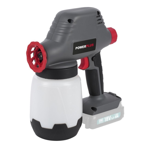Mit diesem Starterset haben Sie alles im Haus, um damit an die Arbeitzu gehen. Es umfasst eine kabellose 18-V-Farbspritzpistole mitErsatzspritzdüse. Vergessen Sie also die Farbpinsel und -rollen!Außerdem beinhaltet dieses Set auch noch den dazugehörigen 18-V-Akkuund das Ladegerät, sodass Sie gleich loslegen können. Der Akku passtauch in alle Elektrogeräte und Gartengeräte aus dem „One FitsAll”-Sortiment von Powerplus.WOZU EIGNET SICH DIESES FARBSPRITZPISTOLEN-STARTERSET?Mit dieser kabellosen 18-V-Farbspritzpistole streichen Sie problemlosgrößere Flächen, wie Ihr Gartenhaus oder den Gartenzaun hinten imGarten. Sie benötigen keinen Strom, also gibt es auch keine Kabel,über die man stolpern kann.Das Gerät arbeitet mit einem „One Fits All”-Akku mit 18 V (1,5Ah), der zu diesem Set gehört. Der Akku passt in alle Elektrogeräteund Gartengeräte aus dem „One Fits All“-Sortiment. Das Setumfasst auch das 18-V-Ladegerät, das sowohl mit den 1,5-Ah- als auchden 3,0-Ah-Akkus kompatibel ist. Die 2 LED-Leuchten des Ladegerätslassen Sie wissen, wann der Akku vollständig geladen ist.DIE VORTEILE DES FARBSPRITZPISTOLEN-STARTERSETS:Vielseitig: Sie können sowohl Öl-, Aluminium- uund Lackfarben fürGrundierungen, zum Beizen und für Holzbehandlungsmittel im großen1-Liter-Vorratsbehälter verwenden.Regulierbare Farbmengenausgabe: Mit dem Regulierknopf hinten am Gerätpassen Sie die Farbmengenausgabe für ein sauberes, gleichmäßigesErgebnis an.Sicher: Für den sicheren Betrieb ist es wichtig, dass der Flammpunktder verwendeten Farbe über 55 °C liegt. Sie können nur streichen,wenn Sie zuerst die Sicherheitstaste drücken, sodass Sie nichtversehentlich Flecken verursachen, wenn Sie zufällig auf den Schalterdrücken.Komfortabel: Dank des Softgrip liegt die Farbspritzpistole gut in derHand.Einfach zu reinigen: Nach dem Streichen reinigen Sie dieFarbspritzpistole mit dem Reinigungsstift ganz einfach.Praktisch:  Die Frabspritzpistole arbeitet mit einem 18-V-Akku undkann somit überall eingesetzt werden. Bei jeder Aufgabe kommen Sie inden Genuss völliger Bewegungsfreiheit.DIE WICHTIGSTEN TECHNISCHEN EIGENSCHAFTEN: * Spannung: 18 V * Max. Viskosität: 60 DIN/s * Durchmesser der Spritzdüse: 0,8 mm * Farbmengenausgabe: 300 g/min * Spritzbreite: 26 mm * Tankvolumen: 1 l * Akkuleistung: 1 500 mAh * Spannung Ladegerät: 220 - 240 VWAS BEFINDET SICH IN DER VERPACKUNG?1 x POWEB5510 Farbspritzpistole1 x Akku 18 V / 1,5 Ah1 x Ladegerät 18 V1 x Ersatzspritzdüse (0,8 mm)1 x Reinigungsstift1 x Viskositätsbehälter2 x Ventil1 x Schlüssel für Spritzdüse1 x Anleitung