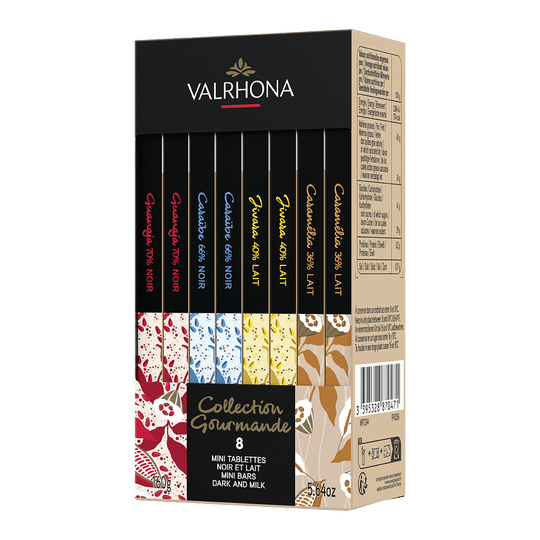 Kunstvolle Kollektion: In diesem Schuber, der an eine literarische Edition erinnert, kommen 8 kleine verschiedene Tafeln feinster Valrhona-Schokoladen. Sie können sich durch 2 x Lait Tanariva mit 33 % Kakaogehalt, 2 x Lait Jivara mit 40 %, 2 x Noir Caraibe mit 66 % Kakao und 2 x Noir Guanaja mit 70 % Kakaogehalt probieren. Die herkunftsreinen Schokoladen sind jeweils aus einer Kakaosorte eines bestimmten Ursprungslandes hergestellt. Das französische Traditionsunternehmen Valrhona bereist die ganze Welt, um die besten Plantagen mit ihren Höhenlagen, Böden und klimatischen Bedingungen ausfindig zu machen. Jeder Kakao steht für ein singuläres Anbaugebiet, dessen Besonderheiten zu neuen Aromen und Kombinationen führen. Ein erlesenes Geschenk für Schokoladenfans und Feinschmecker, das zum nachmittäglichen Espresso und Cappuccino oder als kleines Dessert immer gut passt.