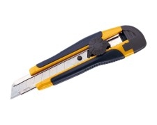 Profi-Schneidemesser mit Metallführung extra stabil Eigenschaften: -"Profiqualität" - für 18 mm breite Klingen -stabiles Kunststoffgehäuse -mit gummiertem Antirutschgriff -Schraubenarretierung -Metallführung für sichere Klingenführung -Schieberaster mit Automatikstopp -Abbrechhilfe in der Kappe -18 mm Klinge, inkl. Ersatzklinge -Farbe: gelb-schwarz