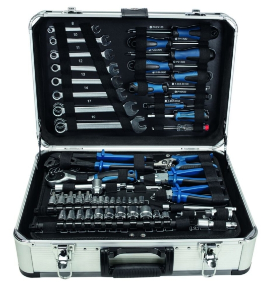 Scheppach TB150 Mobile Werkstatt Der Werkzeugkoffer TB150 von scheppach ist die optimale Lösung für alle Heimwerker, die entweder keinen Platz für eine Werkstatt haben oder einen fertig gepackten Einsatzkoffer für Reparaturen im Haus stets griffbereit haben möchten.  101 Teile umfasst das Werkzeug-Set, das vom Hammer bis zur Wasserpumpenzange alle notwendigen Werkzeuge für den Hausgebrauch enthält.• Stabiler und kompakter Metallkoffer mit ca. 46 x 15 x 32 cm• 101-teiliges Werkzeug-Set für den Hausgebrauch• Gut sortiertes und übersichtlich verstautes Werkzeug• Enthält u.a.:1 Umschaltknarre mit diversen Aufsätzen,je 1 Wasserpumpenzange,Kombizange, Seitenschneider,Trapezmesser, Hammer, Handsäge,Universalschere,Spannungsprüfer,Maßband sowie mehrere Maulschlüssel,Schraubendreher,Innensechskantschlüssel und Bits in unterschiedlichen Größen