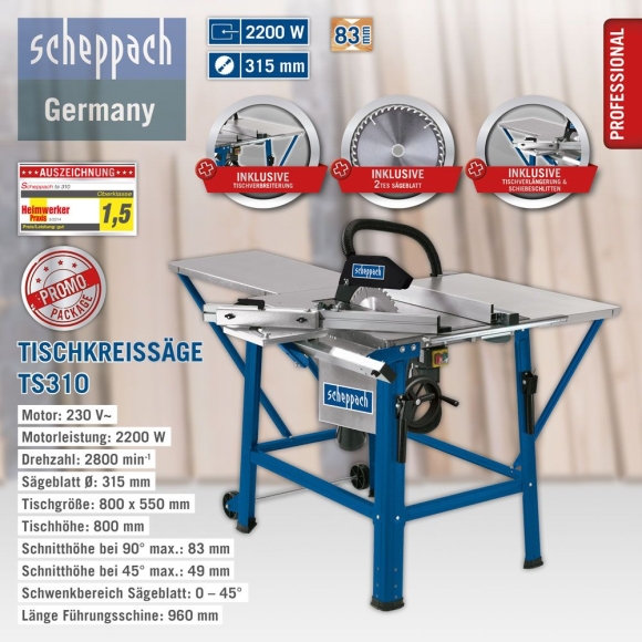 Scheppach Tischkreissäge TS310Stabile 315 mm Tischkreissäge mit seriemmässigem Schiebeschlitten, Tischverbreiterung/-verlängerung und 2. Sägeblatt. Präzise Schnitthöheneinstellung mit großem Handrad. Ideal für Heimwerker und professionelle Anwender. Leistungsstarker 2200 Watt (230 V~; 2200 Watt) Induktions-Motor Serienmäßiger Schiebeschlitten mit Anschlagschiene Stabiles, pulverbeschichtetes Stahl-Untergestell mit verzinktem Arbeitstisch Tischverlängerung und Tischverbreiterung serienmäßig  Sägeblattschutz mit Absaugschlauch Bequeme Schnitthöheneinstellung mittels großem Handrad 83 mm Schnitttiefe 2 langlebige Ø 315 mm HW-Sägeblätter für gleichbleibende und präzise Schnittergebnisse Sägeblattschutz für maximale Arbeitssicherheit Stabile Parallel-Anschlagschiene für Senkrecht- und Schrägschnitte Bequemer Transport durch abklappbare Handgriffe und stabile Fahrvorrichtung