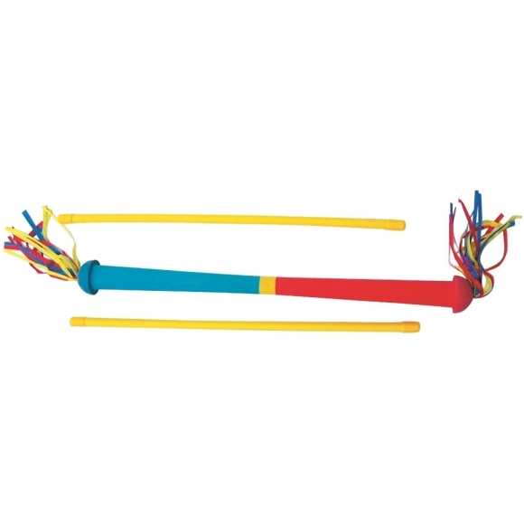 Speziell für Kinder und Anfänger entwickelt. Der Stock ist mit rutschfestem, dynamischem Schaumstoff ummantelt, der sich weich anfühlt. An den Enden befinden sich Halbkugeln mit Bändern, die das Auffangen des Stocks erleichtern. Geliefert mit 60cm langen Stäben und 68g pro Stück.