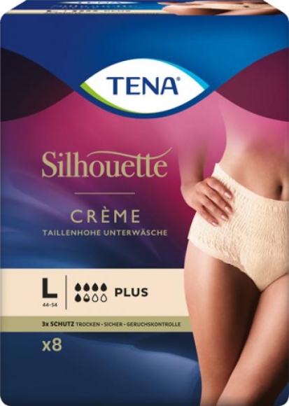 TENA Silhouette Crème Größe L (Gr. 44 - 54), taillenhohe Unterwäsche, mittlere Blasenschwäche, 8 Stück   Netto Füllmenge Nettogehalt 8.00 Stück,Bruttogewicht 508.00 Gramm Allergene   Ursprungsland POLEN Marke TENA Hersteller Name: Essity Austria GmbH,Adresse: Storchengasse 1 1150 Wien