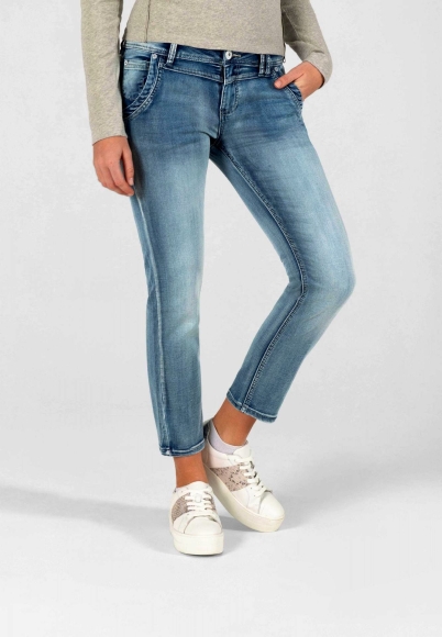 Die Timezone Damenjeans Slim NaliTZ in der 7/8 Länge kleidet dich perfekt für die Übergangszeit. Der weiche, elastische Baumwolle-Polyester-Mix gibt ein angenehmes Tragegefühl. Die Waschung der Hose ist ein helles, verwaschenes Balu mit Abriebstellen und eingearbeiteten Sitzfalten. Dadurch bekommt die Jeans NaliTZ einen leichten und lässigen Look. Das Highlight der Damenjeans von Timezone ist der knöpfbare Hosenschlitz und die Schmucknieten. Die Nähte sind kontrastfarben abgesetzt und verleihen somit der Hose einen sportlichen Look. Kombiniert mit einem weitgeschnittenen Oberteil bist du mit der Damenjeans Slimn NaliTZ von Timezone wunderbar für den Frühling gestylt.Die Jeans ist auch in der Farbe blue denim wash erhältlich. Merkmale + Hersteller: Timezone + Modellname: NaliTZ + Geschlecht: Damen + Farbe: aqua blue wash + Material: 83 % Baumwolle, 15 % Polyester, 2 % Elasthan + Waschung: Used Look (leicht) + Style: 5-Pocket-Style + Gürtelschlaufen: Ja + Anlass: leger + Kollektion: Ganzjahresartikel + Artikelnummer: 17-10048-00-3337-3039Schnitt + Passform: Slim Fit + Verschluss: Knöpfbarer Hosenschlitz + Länge: 7/8 Länge + Beinverlauf: schmal, slim + Bundhöhe: Bund sitzt zwischen Taille und Hüfte + Taschen: Seitentaschen, kleine Geldtasche, Gesäßtaschen mit Ziernähten, kleines Lederpatch am Bund Wasch & Pflegetipps + Waschen: Maschinenwäsche bis 40° Grad + Bügeln: Bei geringer Temperatur (max. 110° Grad) + Chemische Reinigung: Alle allgemeinen üblichen Lösungsmittel erlaubt + Bleichen: Nicht erlaubt + Trocknen: Liegend