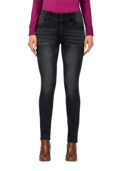 Die Timezone Enya Slim überzeugt duch ihr cooles Design und einem perfekten Sitz.Optisches Highlight sind die Ziernähte und kleine Stern-Nieten an den Taschen.Details+ Farbe: black used+ leichter Used-Look+ Verschluss: Reißverschluss und zwei Knöpfe+ Slim Fit, schmales Bein+ mittlere Bundhöhe+ 5 Pocket-Style+ kleine, schwarze Metallsterne an den EingrifftaschenMaterial70% Baumwolle20% Polyester9% Viskose1% Elastan