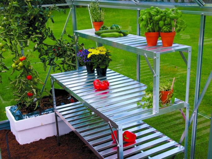 Mit einem solchen Tischaufsatz befreien Sie Ihren Arbeitstisch von Werkzeug oder Anziehtöpfchen, um dann mehr Platz zum Arbeiten zu erhalten. Auch kleine Pflanzen, wie Kräuter, können hierauf hervorragend dauerhaft platziert werden. Da sie passend zum Tisch entwickelt wurden, besitzen sie auch einen stabilen Stand. Aus dem gleichen Material wie die Gewächshausprofile und die Aluminiumische und erhältlich in den passenden Farben der Tische und Gewächshäuser, fügen sie sich schön und unauffällig in Ihr Vitavia Gewächshaus ein und sorgen für den nötigen Platz.