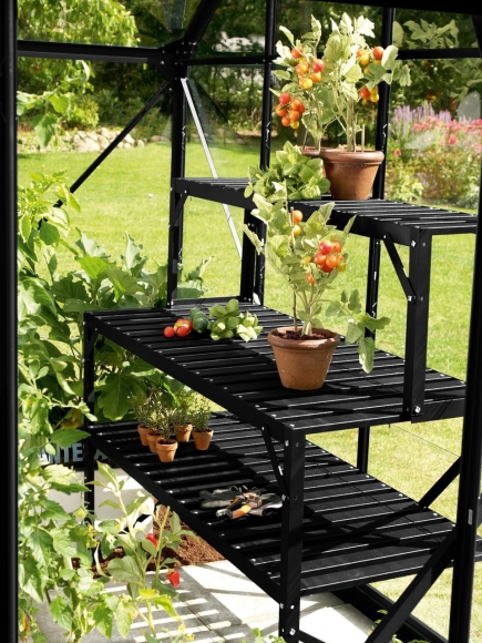 Mit einem solchen Tischaufsatz befreien Sie Ihren Arbeitstisch von Werkzeug oder Anziehtöpfchen, um dann mehr Platz zum Arbeiten zu erhalten. Auch kleine Pflanzen, wie Kräuter, können hierauf hervorragend dauerhaft platziert werden. Da sie passend zum Tisch entwickelt wurden, besitzen sie auch einen stabilen Stand. Aus dem gleichen Material wie die Gewächshausprofile und die Aluminiumische und erhältlich in den passenden Farben der Tische und Gewächshäuser, fügen sie sich schön und unauffällig in Ihr Vitavia Gewächshaus ein und sorgen für den nötigen Platz.