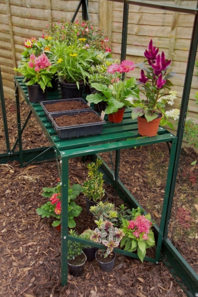 Die Alutische in optimaler Arbeitshöhe bieten mit 54 cm Tiefe fast so viel Platz zum Arbeiten wie eine Standardarbeitsfläche und fügen sich perfekt in kleine und große Gewächshäuser ein – in letzteren werden auch häufig mehrere kombiniert. Die verstrebte Oberfläche lässt Erde einfach durchfallen. Zum Durchwachsen hochwachsender Pflanzen die entsprechenden Alustreben einfach entfernen. Erhältlich in den Farben der Vitavia Gewächshäuser sowie mit einer oder zwei Ablagen. Miteinander und mit den passenden Tischaufsätzen kombinierbar ‚gehören sie zu den wichtigsten Einrichtungsgegenständen im Vitavia Gewächshaus.