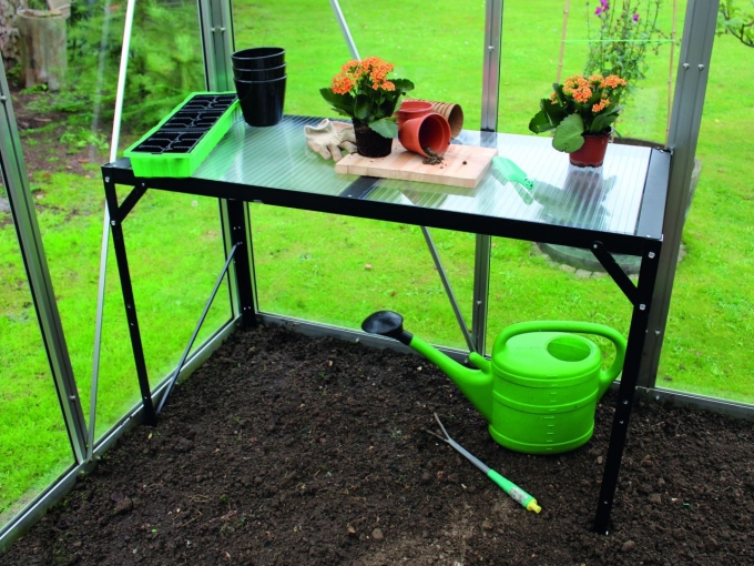 Die Alutische in optimaler Arbeitshöhe bieten mit 54 cm Tiefe fast so viel Platz zum Arbeiten wie eine Standardarbeitsfläche und fügen sich perfekt in kleine und große Gewächshäuser ein – in letzteren werden auch häufig mehrere kombiniert. Zwei Tischplatten mit herausnehmbaren Hohlkammerplatten ermöglichen das Durchwachsen von hochwachsenden Pflanzen unter dem Tisch. Die geteilte Oberfläche stellt dabei sicher, dass bei einer hochwachsenden Pflanze nicht die gesamte Arbeitsplatte weichen muss.
