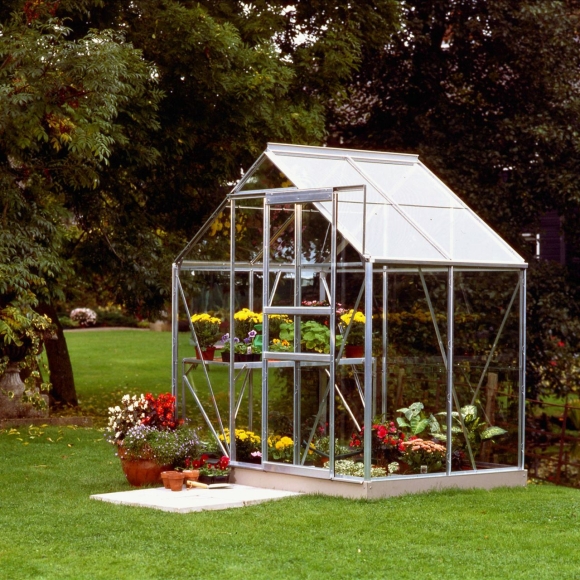 Venus ist Genussgärtnern pur: Unter dem Dach unseres beliebten Modells machen sich selbst Einsteiger mit wenig Aufwand viel Freude.Das Modell ist in vier verschiedenen Größen mit den Grundflächen von 2,5 bis 6,2 m2 und in zwei Farben erhältlich: Aluminium eloxiert oder Smaragd (pulverbeschichtet). Bei der Verglasung kann zwischen Hohlkammerplatten (HKP) und Einscheibensicherheitsglas (ESG) gewählt werden. Die Hohlkammerplatten gibt es in einer Stärke von 4 und 6 mm. Sie bestehen aus UV-stabilisiertem Polycarbonat (PC). Die Dachfensterverglasung hat bei HKP ca. 4 mm und bei ESG eine Stärke von ca. 3 mm. Hohlkammerplatten bieten durch ihre höhere Isoliereigenschaft mehr Vorteile und Funktionalität als Glas (ESG). Sie sind bruchsicher und leichter. Die leicht milchige Oberfläche bricht das Licht, sodass meist kein Abschattieren notwendig ist. Einscheibensicherheitsglas garantiert stattdessen eine hohe Lichtdurchlässigkeit und besticht durch die „klassische“ Glasoptik. An sonnigen, heißen Tagen sollte das Glas jedoch abschattiert werden, um die Pflanzen vor Verbrennung zu schützen. Das gehärtete Glas (ESG) kann nicht scharfkantig brechen und sorgt somit für mehr Sicherheit. Das Modell Venus hat eine leichtgängige, kugelgelagerte Schiebetür mit einer Breite von 61 cm und einer Höhe von 161 cm und ein kittloses Verglasungssystem mit rostfreien Glasfederklammern. Je nach Modell ist es serienmäßig mit ein oder zwei Dachfenstern ausgestattet. Die Regenrinnen gehören auch zur Standardausstattung. Für den ebenerdigen und rechtwinkligen Aufbau des Gewächshauses ist ein Fundamentrahmen aus verzinktem und farbbeschichtetem Stahlblech besonders hilfreich.