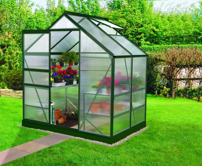 Venus ist Genussgärtnern pur: Unter dem Dach unseres beliebten Modells machen sich selbst Einsteiger mit wenig Aufwand viel Freude.Das Modell ist in vier verschiedenen Größen mit den Grundflächen von 2,5 bis 6,2 m2 und in zwei Farben erhältlich: Aluminium eloxiert oder Smaragd (pulverbeschichtet). Bei der Verglasung kann zwischen Hohlkammerplatten (HKP) und Einscheibensicherheitsglas (ESG) gewählt werden. Die Hohlkammerplatten gibt es in einer Stärke von 4 und 6 mm. Sie bestehen aus UV-stabilisiertem Polycarbonat (PC). Die Dachfensterverglasung hat bei HKP ca. 4 mm und bei ESG eine Stärke von ca. 3 mm. Hohlkammerplatten bieten durch ihre höhere Isoliereigenschaft mehr Vorteile und Funktionalität als Glas (ESG). Sie sind bruchsicher und leichter. Die leicht milchige Oberfläche bricht das Licht, sodass meist kein Abschattieren notwendig ist. Einscheibensicherheitsglas garantiert stattdessen eine hohe Lichtdurchlässigkeit und besticht durch die „klassische“ Glasoptik. An sonnigen, heißen Tagen sollte das Glas jedoch abschattiert werden, um die Pflanzen vor Verbrennung zu schützen. Das gehärtete Glas (ESG) kann nicht scharfkantig brechen und sorgt somit für mehr Sicherheit. Das Modell Venus hat eine leichtgängige, kugelgelagerte Schiebetür mit einer Breite von 61 cm und einer Höhe von 161 cm und ein kittloses Verglasungssystem mit rostfreien Glasfederklammern. Je nach Modell ist es serienmäßig mit ein oder zwei Dachfenstern ausgestattet. Die Regenrinnen gehören auch zur Standardausstattung. Für den ebenerdigen und rechtwinkligen Aufbau des Gewächshauses ist ein Fundamentrahmen aus verzinktem und farbbeschichtetem Stahlblech besonders hilfreich.