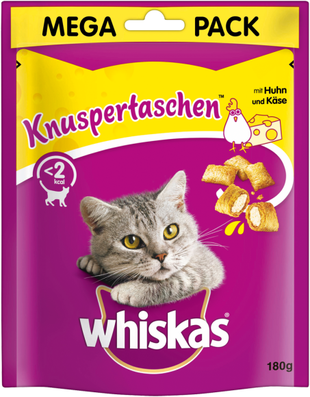 WHISKAS  KNUSPERTASCHEN™ Beutel mit Huhn und Käse 180gWHISKAS  KNUSPERTASCHEN™ mit Huhn & Käse sind köstliche Katzenleckerlis mit einer knusprigen Hülle und einem unwiderstehlich cremigen Kern. Die Vielfalt unterschiedlicher Geschmacksrichtungen bietet eine großartige Möglichkeit, Ihrer Katze die Leckerlis zu geben, die sie liebt - mit weniger als 2 kcal pro Stück. Angereichert mit zusätzlichen Vitaminen und Mineralstoffen. WHISKAS® KNUSPERTASCHEN™ sind köstliche Katzenleckerlis mit einer knusprigen Hülle und einem unwiderstehlich cremigen Kern. Katzensnacks mit weniger als 2 kcal pro Leckerli. WHISKAS® Katzenleckerli sind angereichert mit Vitaminen und Mineralstoffen und enthalten keine künstlichen Aromastoffe. Die köstlichen Mahlzeiten und Katzensnacks von WHISKAS® enthalten alles, was Ihre Katze benötigt. WHISKAS® KNUSPERTASCHEN™ sind erhältlich mit Huhn & Käse, Lachs, Rind sowie mit Pute - denn Katzen lieben Abwechslung.WHISKAS® kennt Katzen. Deshalb verwenden wir leckere, nährstoffreiche Zutaten, denen Ihre Katze nicht widerstehen kann. Alle WHISKAS® Katzenfutter-Rezepturen werden mit großer Sorgfalt entwickelt, damit Ihre Katze genau das bekommt, was sie von Natur aus benötigt. Mit Katzenfutter und Snacks von WHISKAS® bleibt sie glücklich und gesund. Entwickelt von unseren Spezialisten in WALTHAM™, dem weltweit führenden Experten in Sachen Pflege und Ernährung von Haustieren. Jede einzelne Katzen-Mahlzeit ist vollwertig und ausgewogen. Verwöhnen Sie Ihre Katze mit dem Besten. Fütterungsempfehlung Fütterungsempfehlung: Füttern Sie bis zu 12 Stück täglich. Reduzieren Sie die Vollnahrung entsprechend. Innerhalb von 4 Wochen nach dem Öffnen verbrauchen. Innerhalb von 4 Wochen nach dem Öffnen verbrauchen. Ein Extranapf mit frischem Trinkwasser sollte immer bereitstehen.