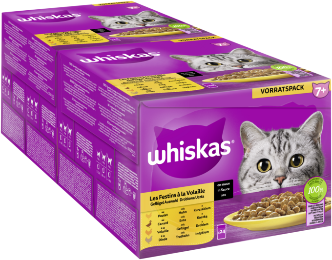 WHISKAS® Portionsbeutel Multipack 7+ Geflügel Auswahl in Sauce mit Huhn, mit Ente, mit Geflügel, mit Truthahn 24 x 85gHochwertiges Katzenfutter in Sauce für Katzen ab 1 Jahr. Verwöhne deinen Liebling mit köstlichem Nassfutter mit Rind und Lamm in der Großpackung. Bereite deiner Katze eine Freude! Speziell zubereitet, um das natürlich Gute und Köstliche der hochwertigen Zutaten zu bewahren. Mit unseren Lieblingsmahlzeiten eilt deine Katze schneller als je zuvor zum Napf! Vom verspielten Kätzchen bis zur wunderbar älteren Katze enthalten unsere schmackhaften Rezepturen alles, was deine Katze für ihr Alter braucht. Zubereitet für zufriedenes Schurren...während der Mahlzeiten und darüber hinaus.Als Katzenliebhaber wissen wir, dass Schnurren das schönste Geräusch ist, das man hören kann. Deshalb kreieren wir mit großer Leidenschaft köstliche Mahlzeiten, die Katzen auf der ganzen Welt dazu bringen, mit schnurrender Begeisterung zu ihren Näpfen zu eilen. Jedes Gericht wird mit Liebe und Sorgfalt zubereitet und ist ernährungsphysiologisch ausgewogen, um dabei zu helfen, dass deine Katze alles hat, was sie braucht, um bei den Mahlzeiten zu schnurren – und nicht nur dann. Jede köstliche Rezeptur enthält 100% hochwertige Zutaten und deckt alle täglichen Bedürfnisse deiner 1+ Katze. Wissenschaftlich ausgewogener Mineralstoffgehalt zur Unterstützung gesunder Harnwege. Mit B-Vitaminen und Eisen zur Unterstützung von Beweglichkeit und voller Vitalität im Alter. Enthält Vitamin C, E und Taurin zur Unterstützung der natürlichen Abwehrkräfte. Wir sind bestrebt, unsere Umweltauswirkungen zu verringern. 85% unserer Fabriken in Europa nutzen Strom aus erneuerbaren Energien, und wir arbeiten daran, dies bis 2025 auf 100% zu erhöhen.Fütterungsempfehlung:1 Portionsbeutel lässt sich durch 16 g WHISKAS® Trockennahrung ersetzen. Berücksichtigen Sie die Kalorien, die von Snacks stammen. Passen Sie die Fütterungsmenge den Bedürfnissen Ihrer Katze an. Wie Besuchen Sie unsere Website. Stellen Sie frisches Trinkwasser bereit. Bitte bei Zimmertemperatur servieren. Bitte beachten Sie die Fütterungstabelle auf der Verpackung für eine individuelle Anpassung für Ihr Tier.Zusammensetzung:Fleisch und tierische Nebenerzeugnisse (34%, u.a. 4% Huhn im Häppchen*), Getreide, pflanzliche Nebenerzeugnisse, Mineralstoffe, Zucker. *Häppchen machen 40% des Produkts aus. # mit Ente - Zusammensetzung: Fleisch und tierische Nebenerzeugnisse (34%, u.a. 4% Ente im Häppchen*), Getreide, pflanzliche Nebenerzeugnisse, Mineralstoffe, Zucker. *Häppchen machen 40% des Produkts aus. # mit Geflügel - Zusammensetzung: Fleisch und tierische Nebenerzeugnisse (34%, u.a. 4% Geflügel im Häppchen*), Getreide, pflanzliche Nebenerzeugnisse, Mineralstoffe, Zucker. *Häppchen machen 40% des Produkts aus. # mit Truthahn - Zusammensetzung: Fleisch und tierische Nebenerzeugnisse (34%, u.a. Truthahn 4% im Häppchen*), Getreide, pflanzliche Nebenerzeugnisse, Mineralstoffe, Zucker. *Häppchen machen 40% des Produkts aus.Analytische Bestandteile: Protein: 7.3; Fettgehalt: 4.0; anorganischer Stoff: 1.6; Rohfaser: 0.25; Feuchtigkeit: 84.5; Calcium: 0.30; Phosphor: 0.22. Brennwert: 61 kcal/85 g.Zusatzstoffe:Zusatzstoffe pro kg: Ernährungsphysiologische Zusatzstoffe: Vitamin B₁: 27.3 mg, Vitamin B₂: 1.4 mg, Vitamin B₆: 4.6 mg, Vitamin C: 702 mg, Vitamin D₃: 200 IE, Vitamin E: 138 mg, Taurin: 1101 mg, Kupfer (Kupfer(II)-sulfat-Pentahydrat): 1.2 mg, Jod (Calciumjodat wasserfrei): 0.28 mg, Eisen (Eisen-(II)-sulfat-Monohydrat): 14.0 mg, Mangan (Mangan(II)-sulfat, Monohydrat): 2.8 mg, Zink (Zinksulfat Monohydrat): 16.2 mg / Sensorische Zusatzstoffe: Aromen.